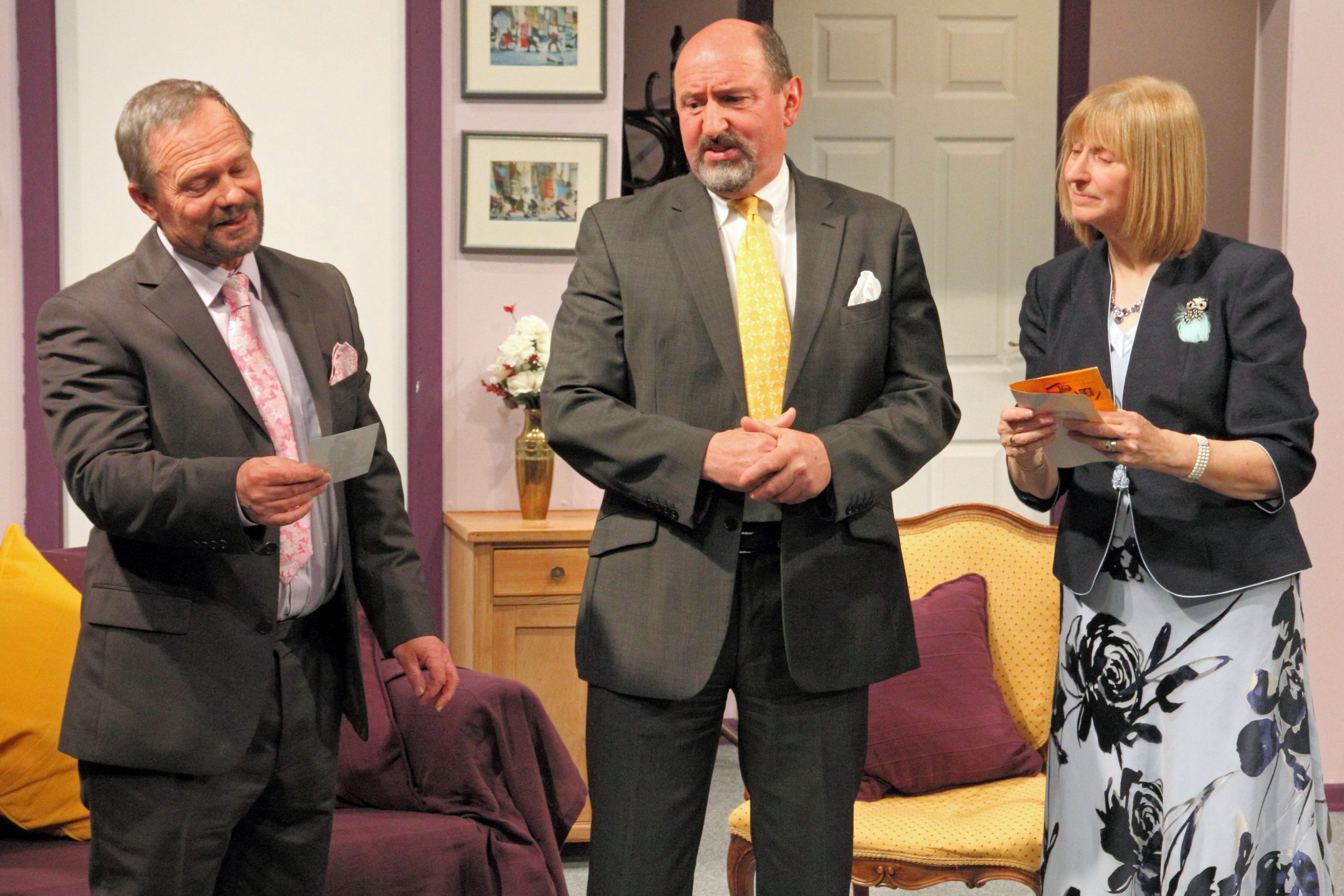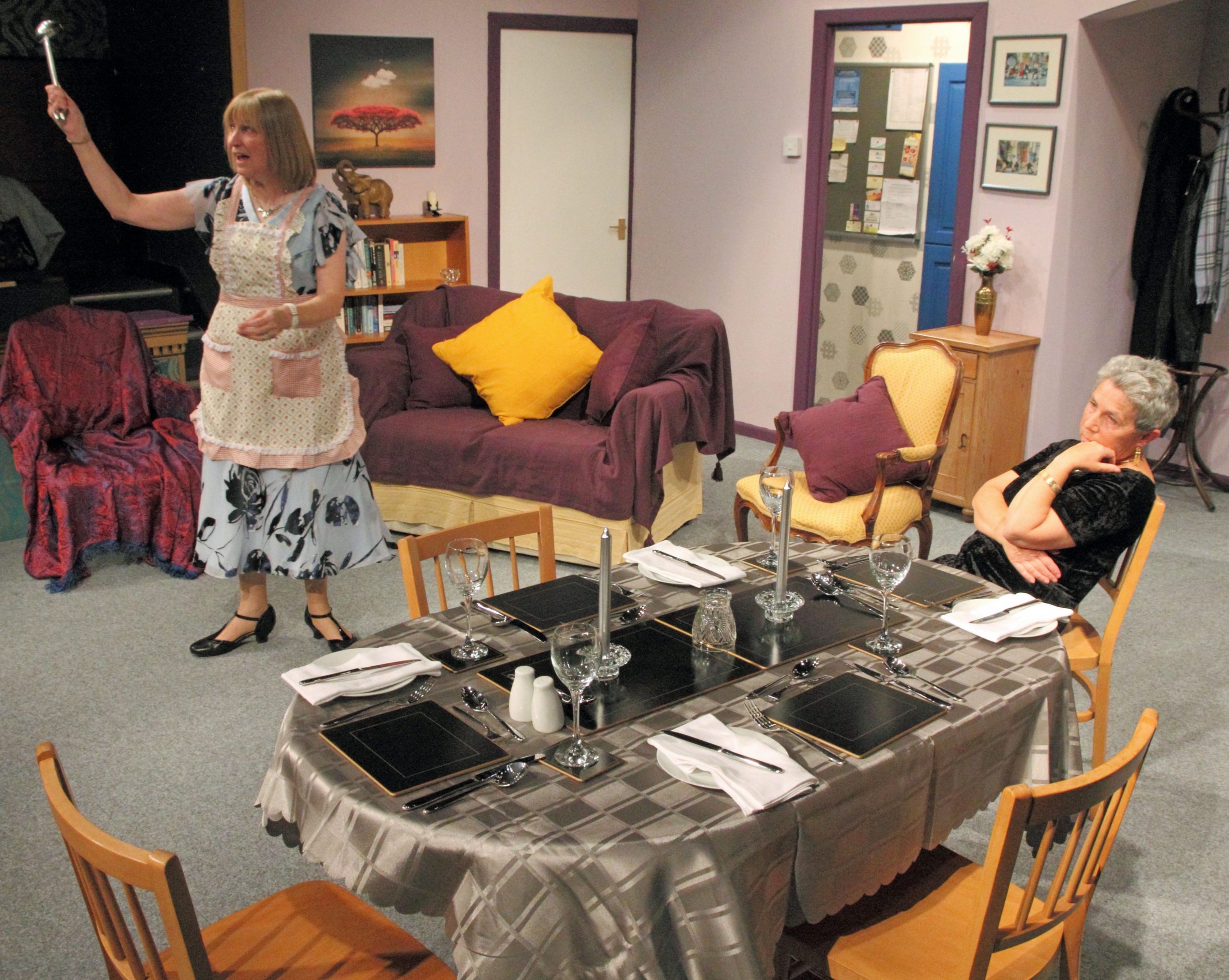 Meanwhile, the female members of Olive’s Trivial Pursuit Club, who previously mistrusted the snacks served past expiry date, now have to contend with their Club cards being disinfected thanks to Florence’s arrival in the house. Here, the supporting cast crack through a series of one-liners with the aplomb of stand-up comics – or rather sit-down comics as they banter round the Trivial Pursuit table. Congratulations to the snappy ensemble of Rachel Joynson, Jenny MacNair, Heather Appleton and Claire Prescott, the latter a newcomer to the Playhouse stage. Each one has individual quirks but collectively they function as a Greek chorus, filling in background for the audience with sharp-witted commentary.
