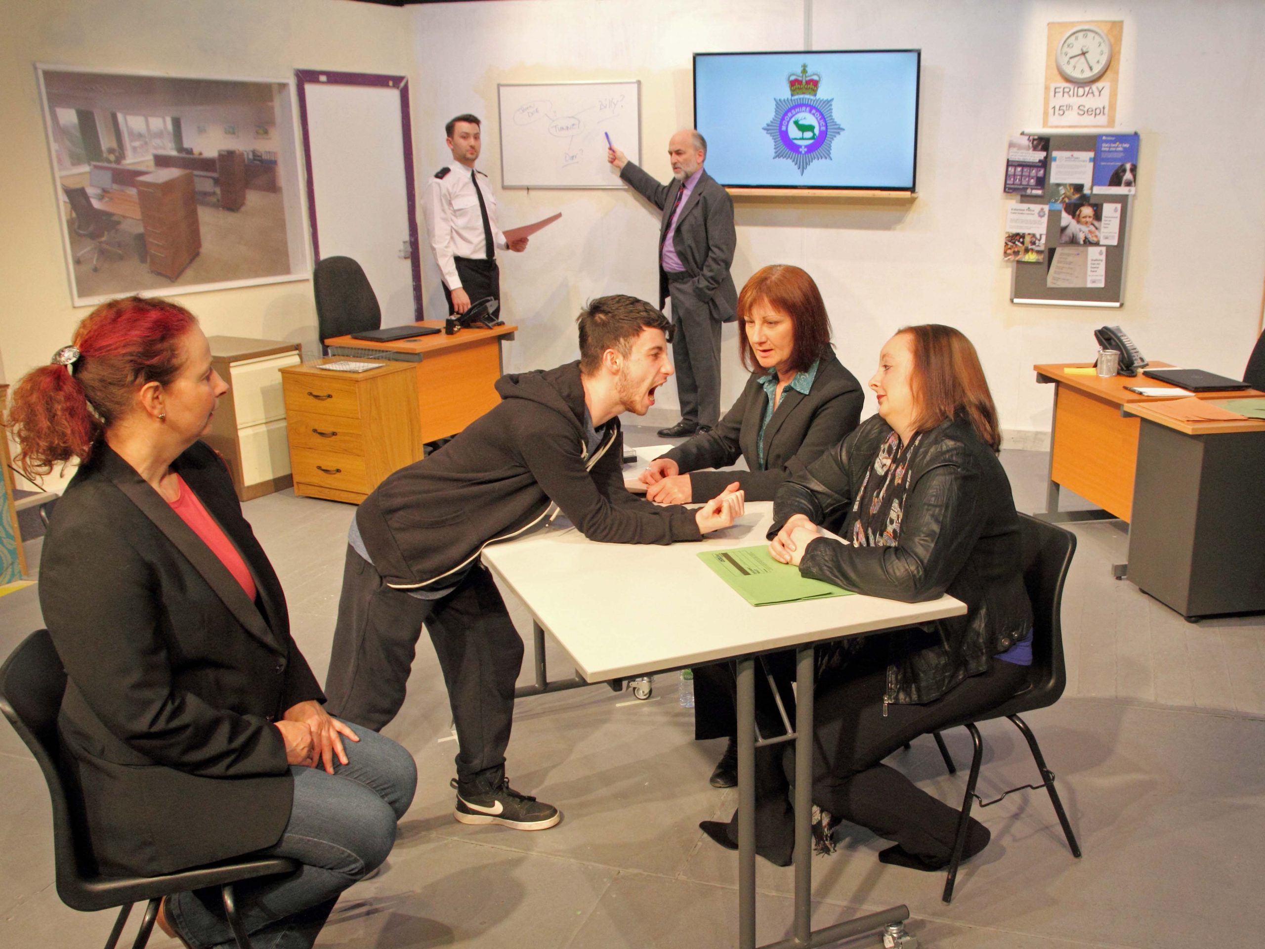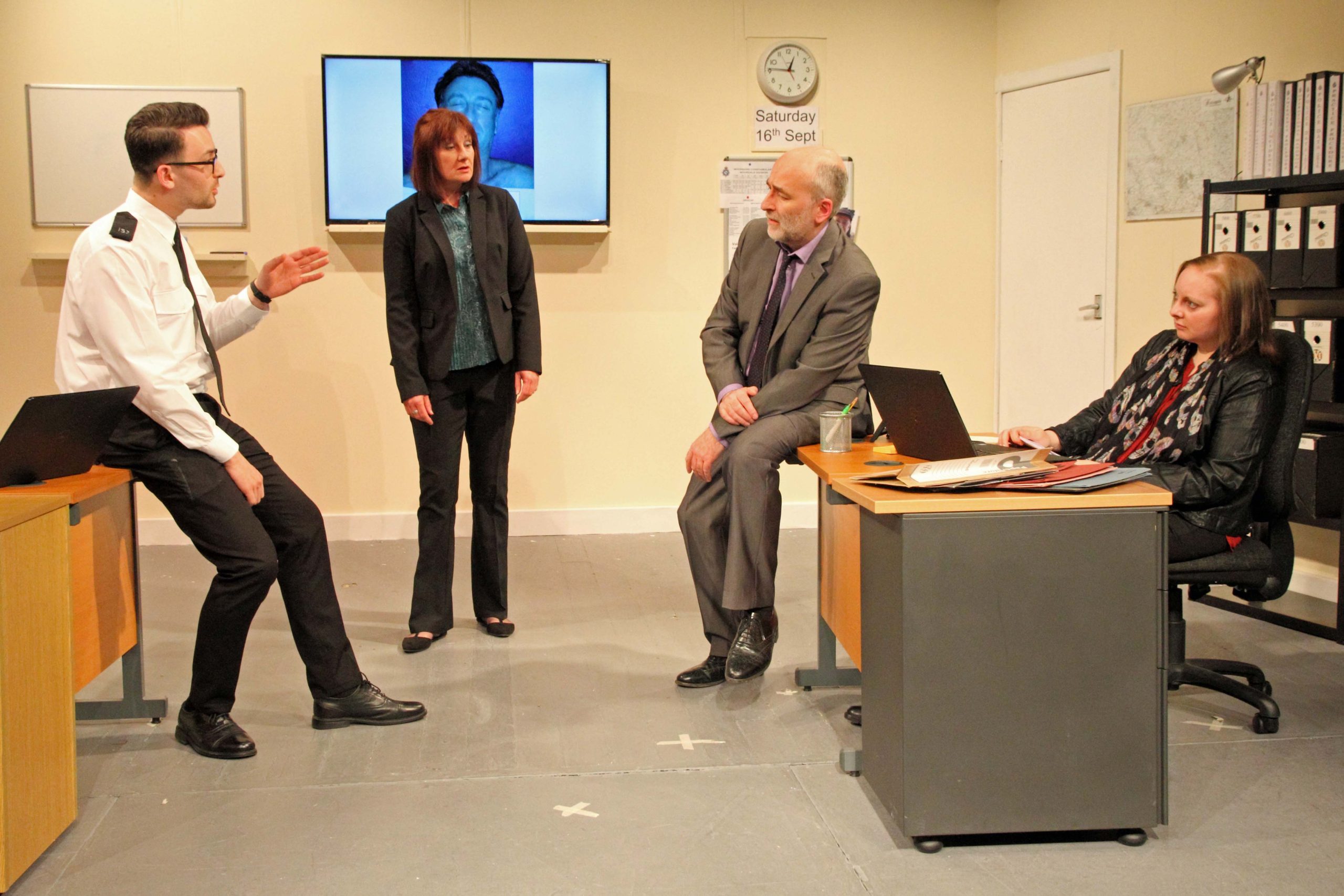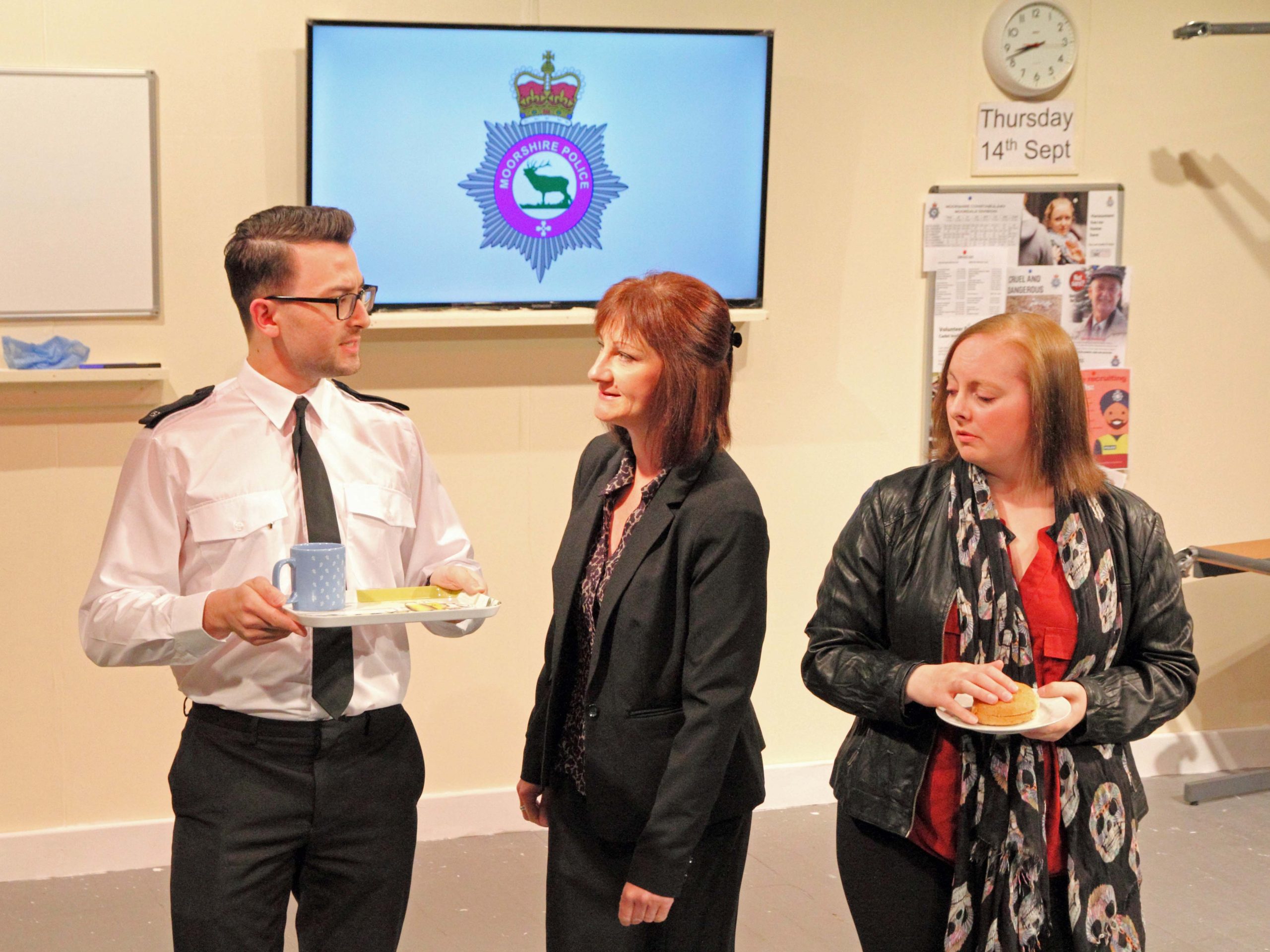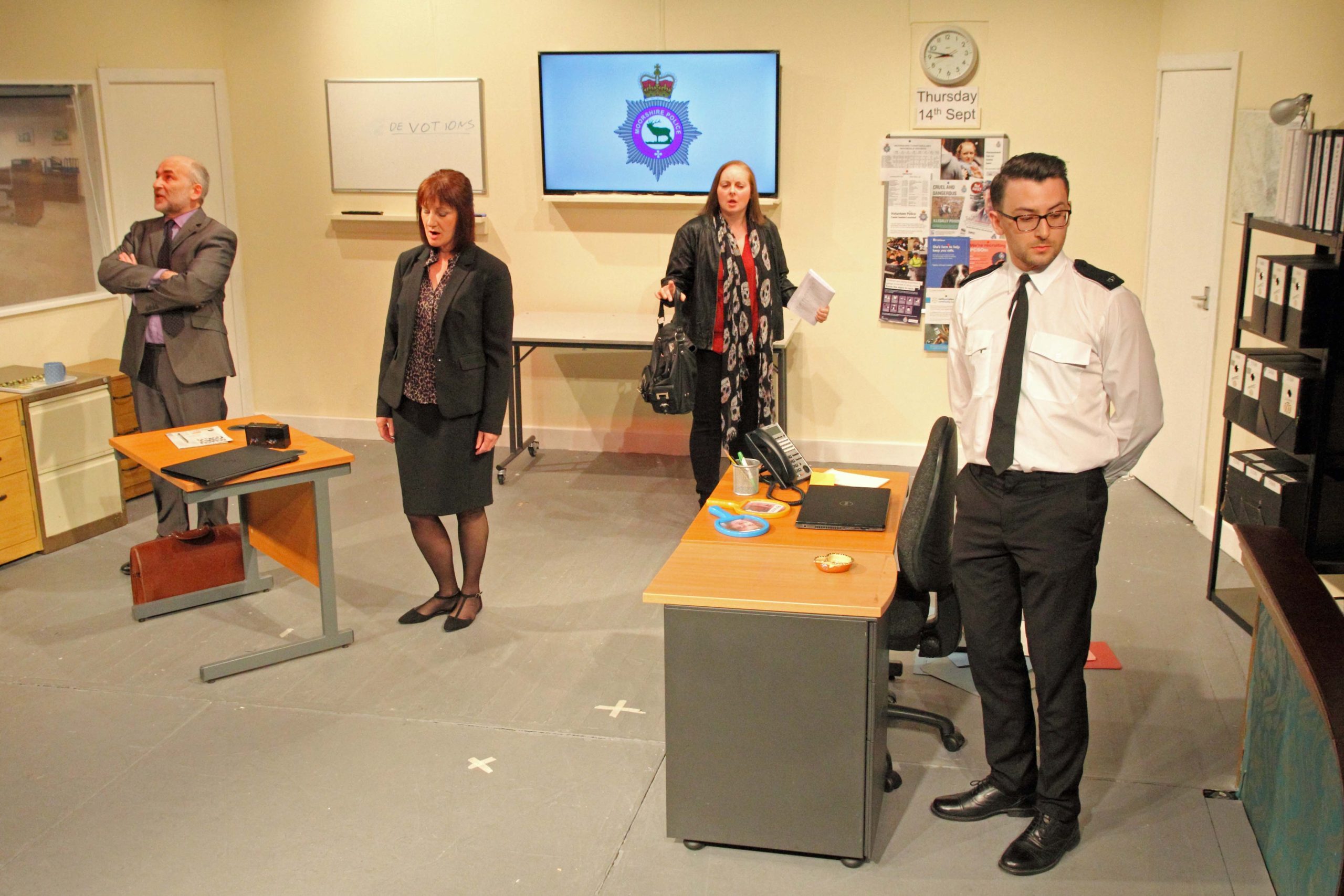 The main action begins on an open set in the office of DCI Ros Jakes.  Doors either side of the stage create the illusion of a busy police station with brisk entrances and exits.  Noticeboards, files, cabinets alongside the usual office paraphernalia are no surprise.  However, the audience could not fail to be impressed by the large television screen across the rear of the set which becomes our visual aid, helping to keep us abreast of the twist and turns of the plot with images of characters and scenes involved in the “mystery” as the action progresses.  Sue Hickson manages the sound and audio-visual effects extremely well throughout the evening.  The live TV streaming of the action from the stage during the police interview in Act two is a fabulous touch and a definite first for the Society.  Never intrusive, the technology helps to order the evidence and remind the audience of key characters – vital in such a complex story.