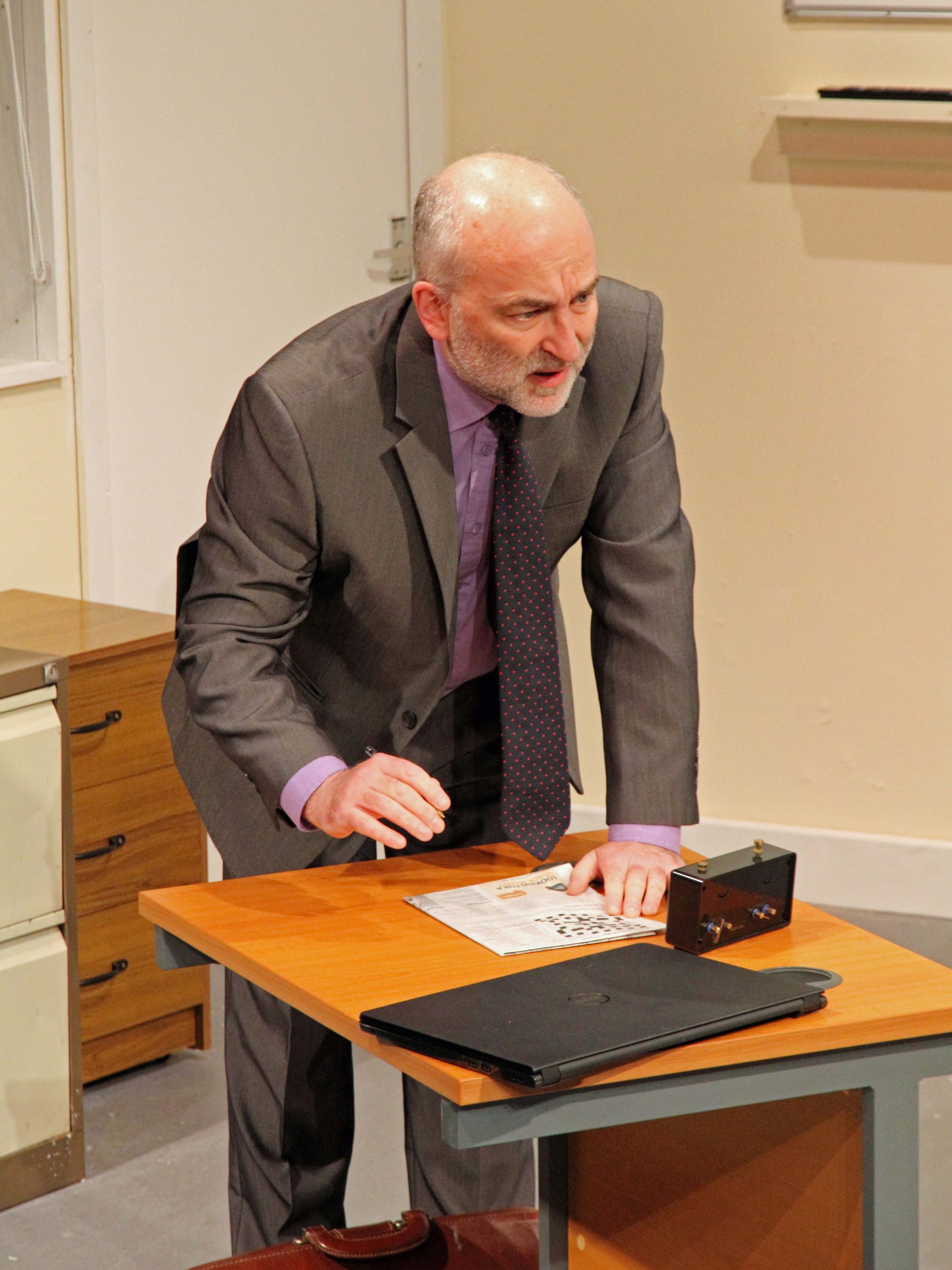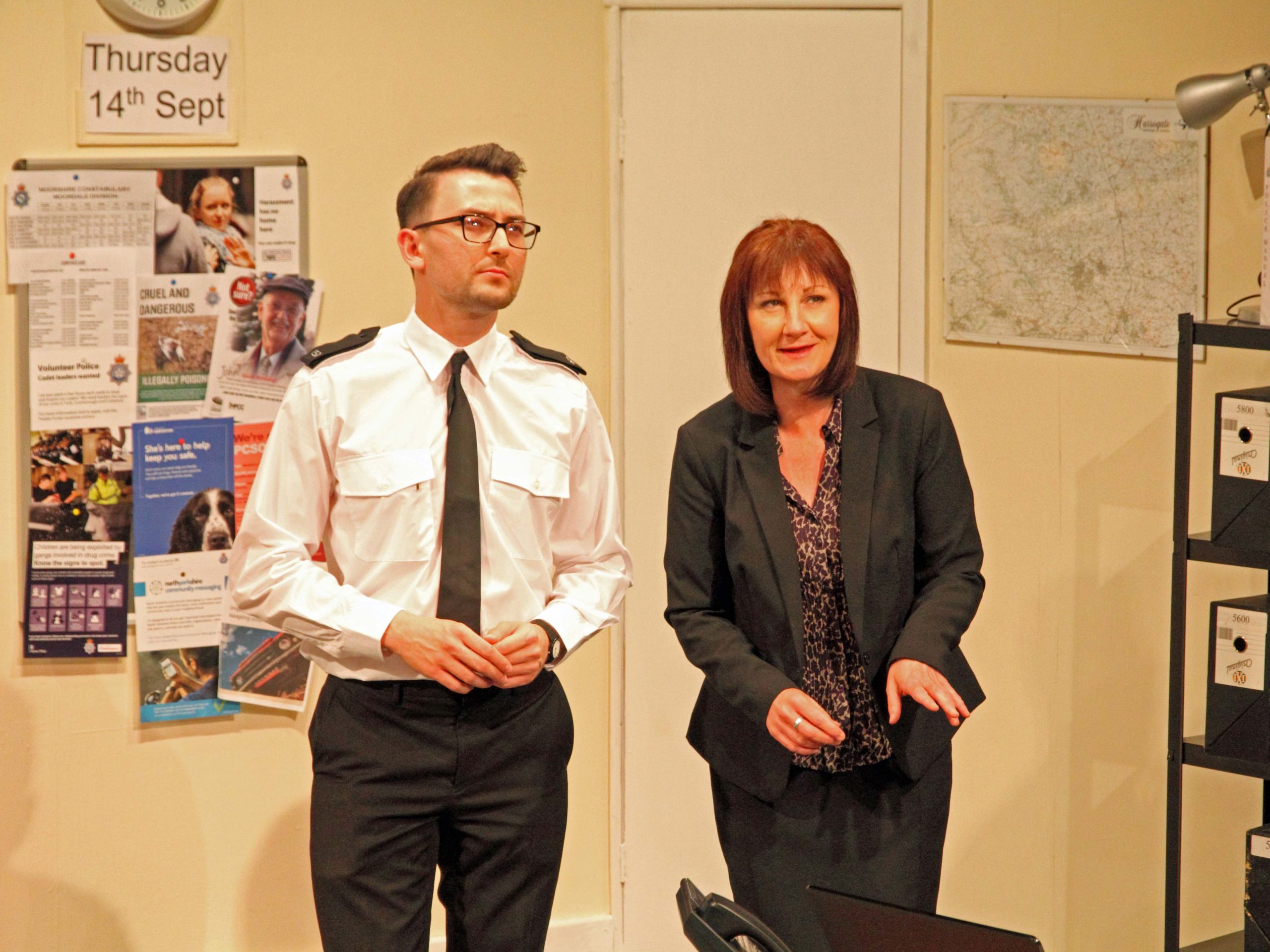 DCI Ros Jakes, played by Heather Appleton, is a brittle Northerner with a fondness for cigarettes and unhealthy sandwiches.  Heather ably demonstrates Ros’ unorthodox approach to policing and uncompromising attitude to marriage with Gerald: opening his post, taking his precious vinyl records to a charity shop and instigating the removal of his car to the police pound.  She is very comfortable moving around her office, owning the space in such a way that we never question her authority.  She brings out the character’s self-belief most convincingly whilst allowing us to glimpse that inner vulnerability which makes us wonder if she and Gerald may just stay together after all.  Her interchanges with her subordinates are especially keenly observed, which is typical of this actress.  It is very difficult to believe that Heather Appleton had stepped into the role a mere three weeks ago when the original cast member was taken ill.  This is a central part in the play in every sense with so many words to learn and such a complex character to portray.  Pateley Bridge Dramatic Society is very fortunate to have such a depth of talent and such dedicated actors.