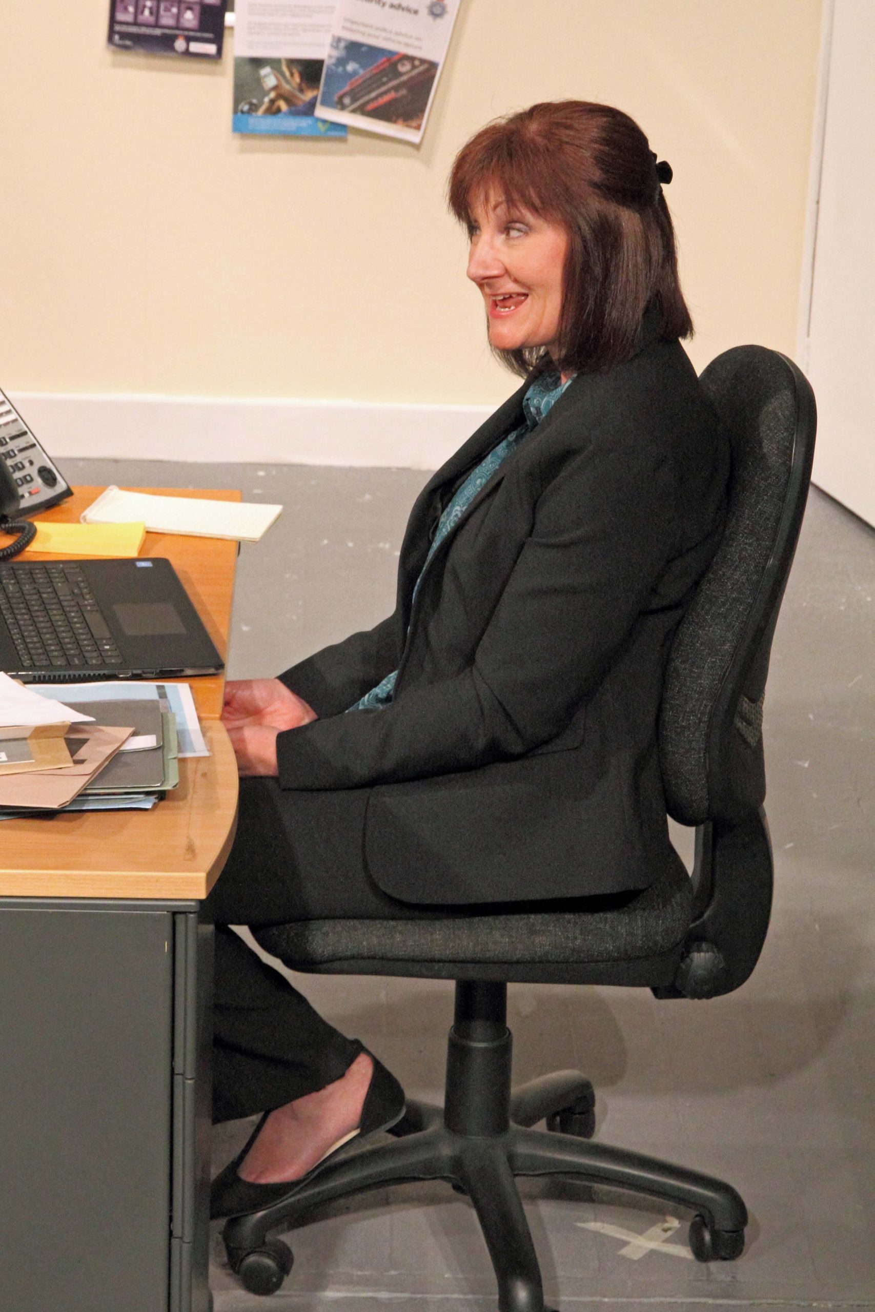 Billy’s guardian and biological mother, Maxine Clayton (Debbie Forsyth) just happens to be the Police and Crime Commissioner who is definitely unafraid to exert her considerable influence in order to ensure that her son is exonerated from any blame when the body of a porter turns up after Billy’s threatened to kill him.  Debbie Forsyth plays the role with that deft touch of entitled authority and confidence which sweeps her into the office without unnecessary introduction.  Her posture and diction make a perfect counterpoint to that of the others, especially that of her obnoxious son, Billy.  Despite her brisk, uncompromising manner, Debbie manages to bring out the softer, genuine caring mother who is prepared to cross a professional line to prove her son’s telling the truth.