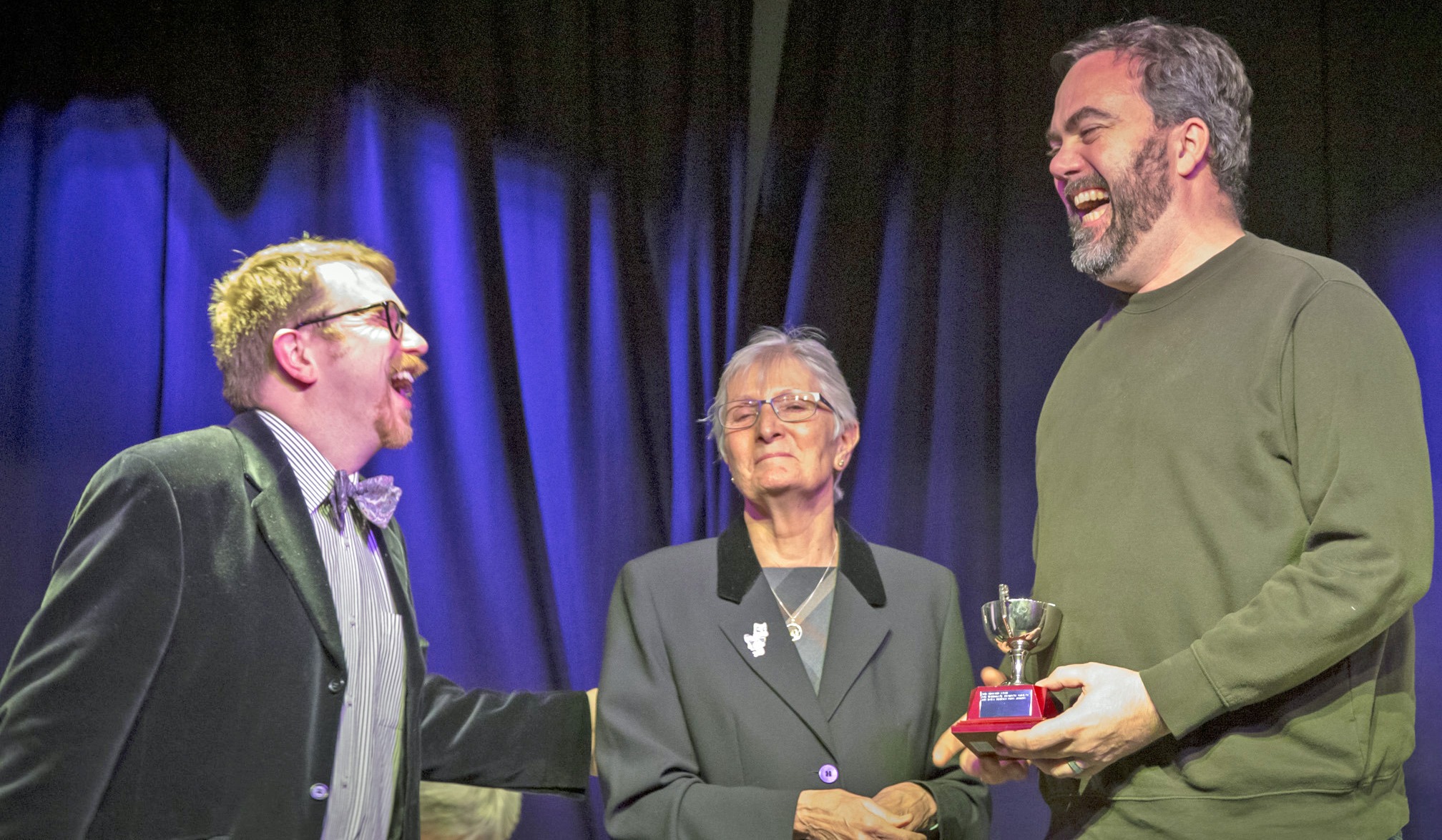Adjudicator Chris Baglin shares a joke with Brad Pollard as Sue Hickson presents the David Crumpton Memorial Cup