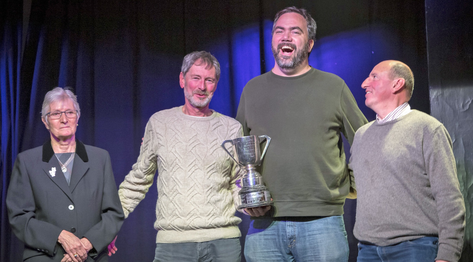 Sue Hickson presents the Ripon & Pateley Bridge RDC Challenge Trophy to cast members Michael Thorne, Brad Pollard & Tim Wilkinson