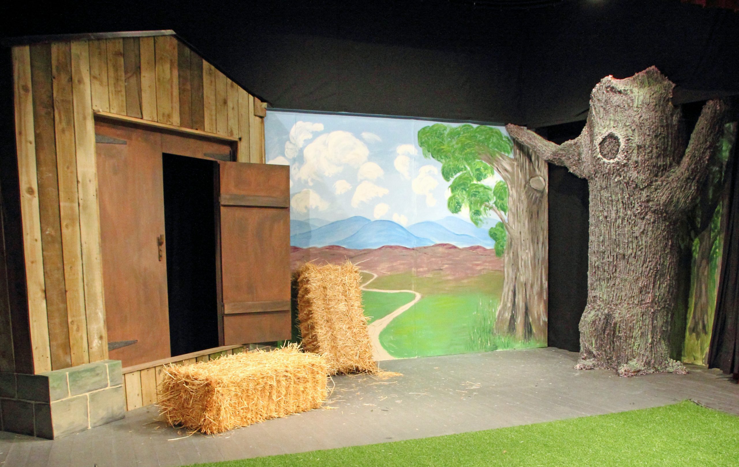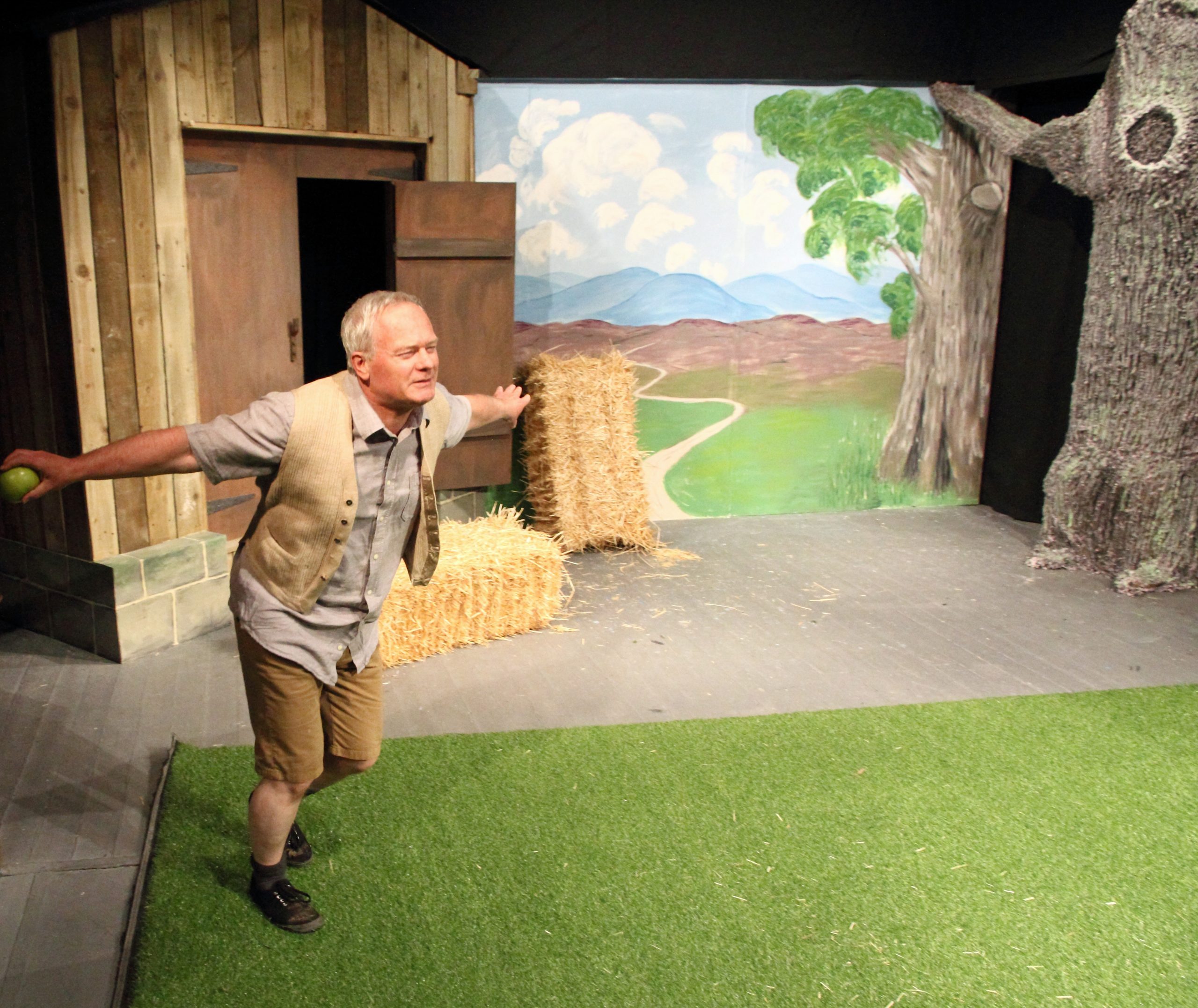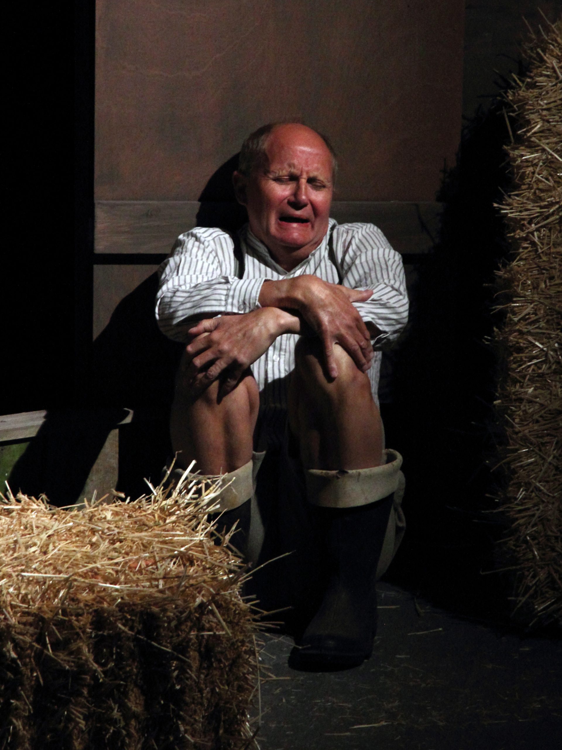 The set has a wonderful tree and an unfortunate squirrel. Its hut and realistic effects with smoke and flames are very well done. The ‘blue, remembered hills’ painted scene, ‘grass’ and straw bales provide a strong framework for the action. Good work from the sound and lighting department to back this up.