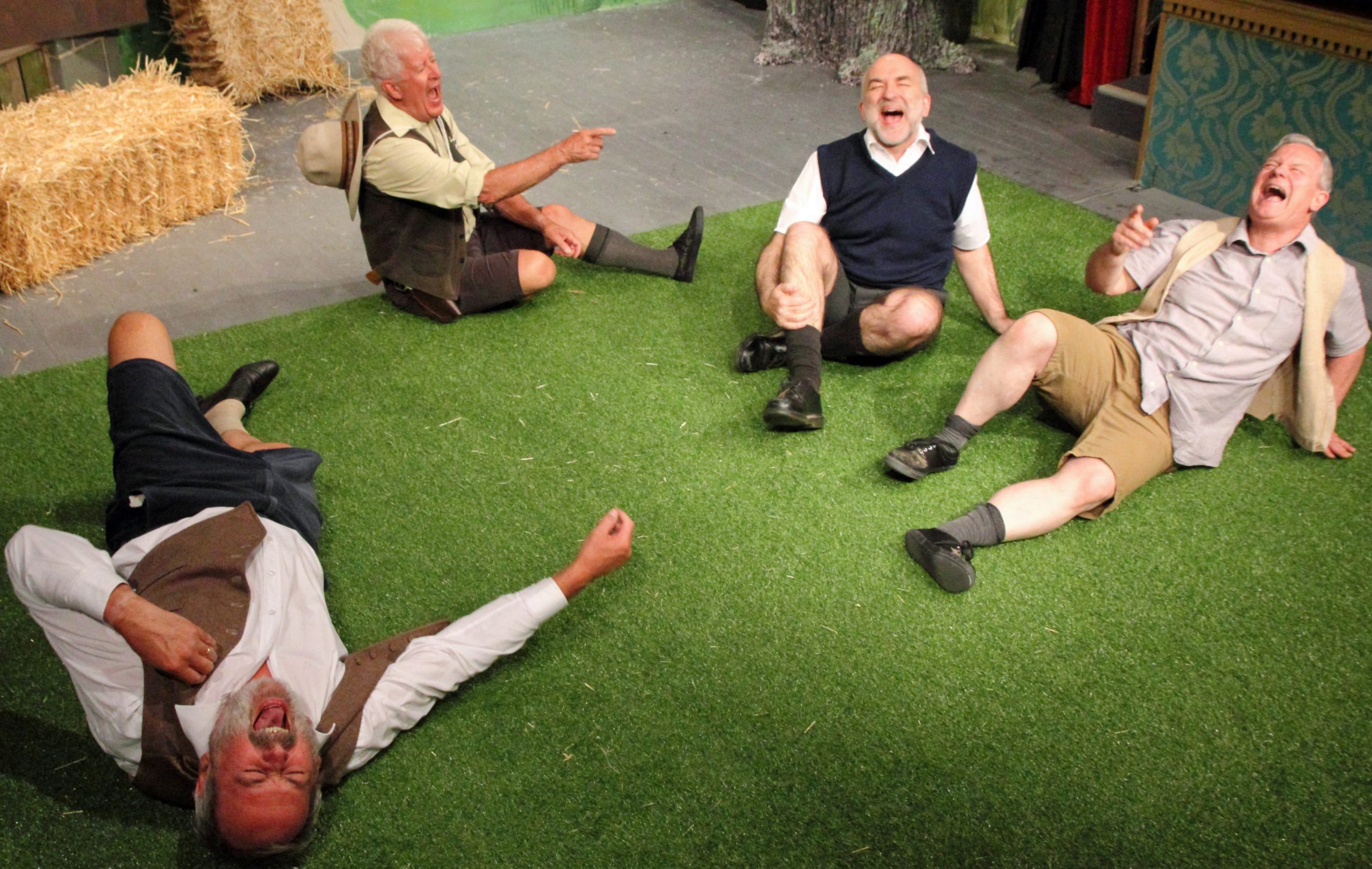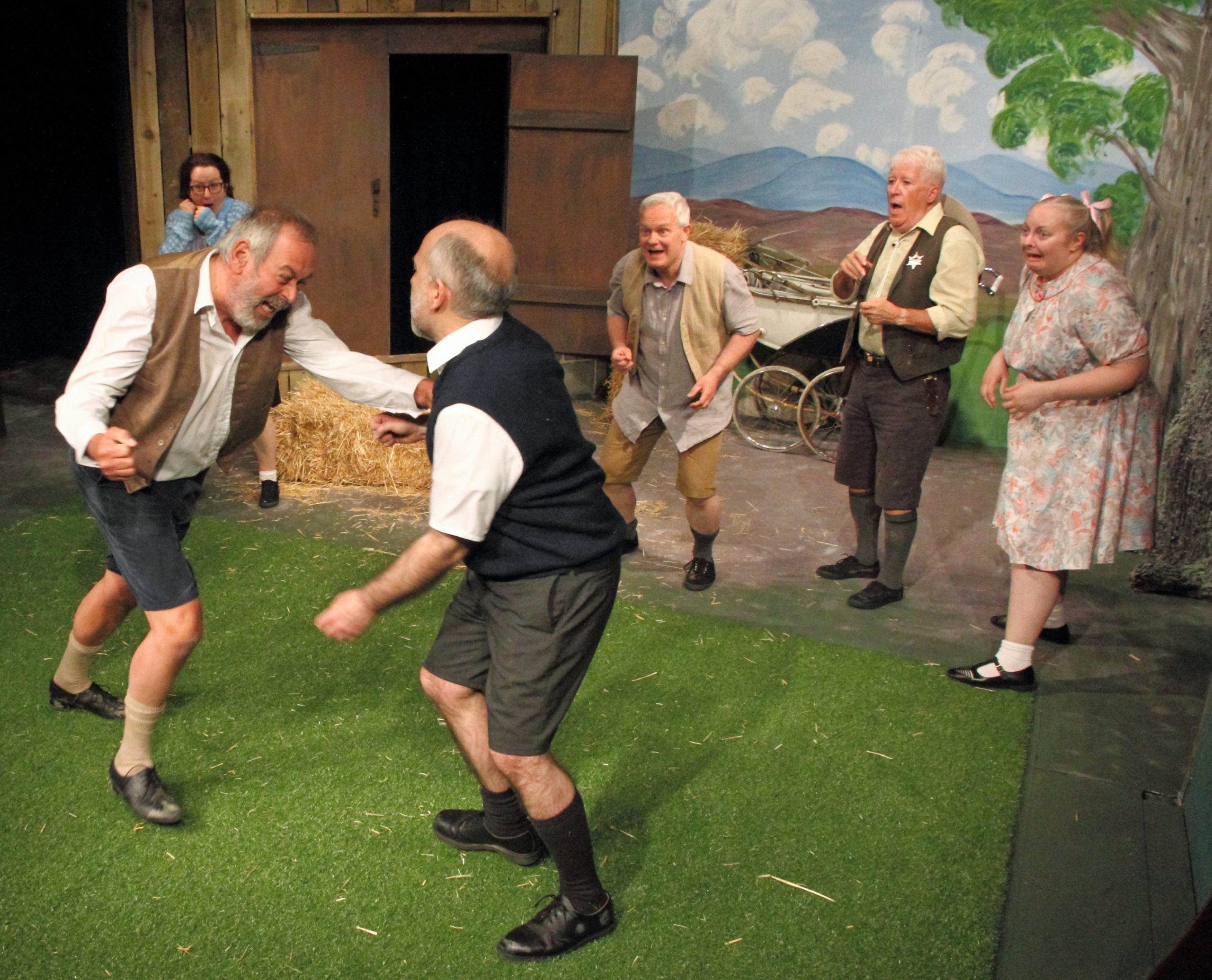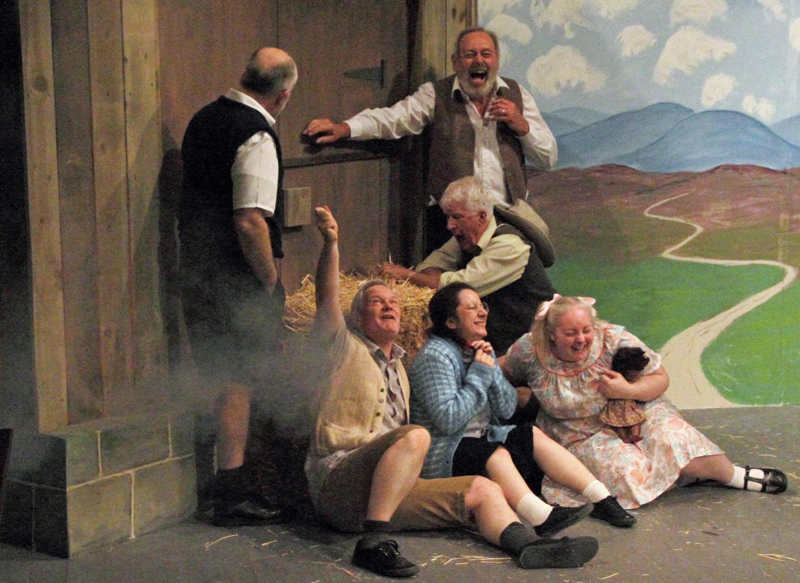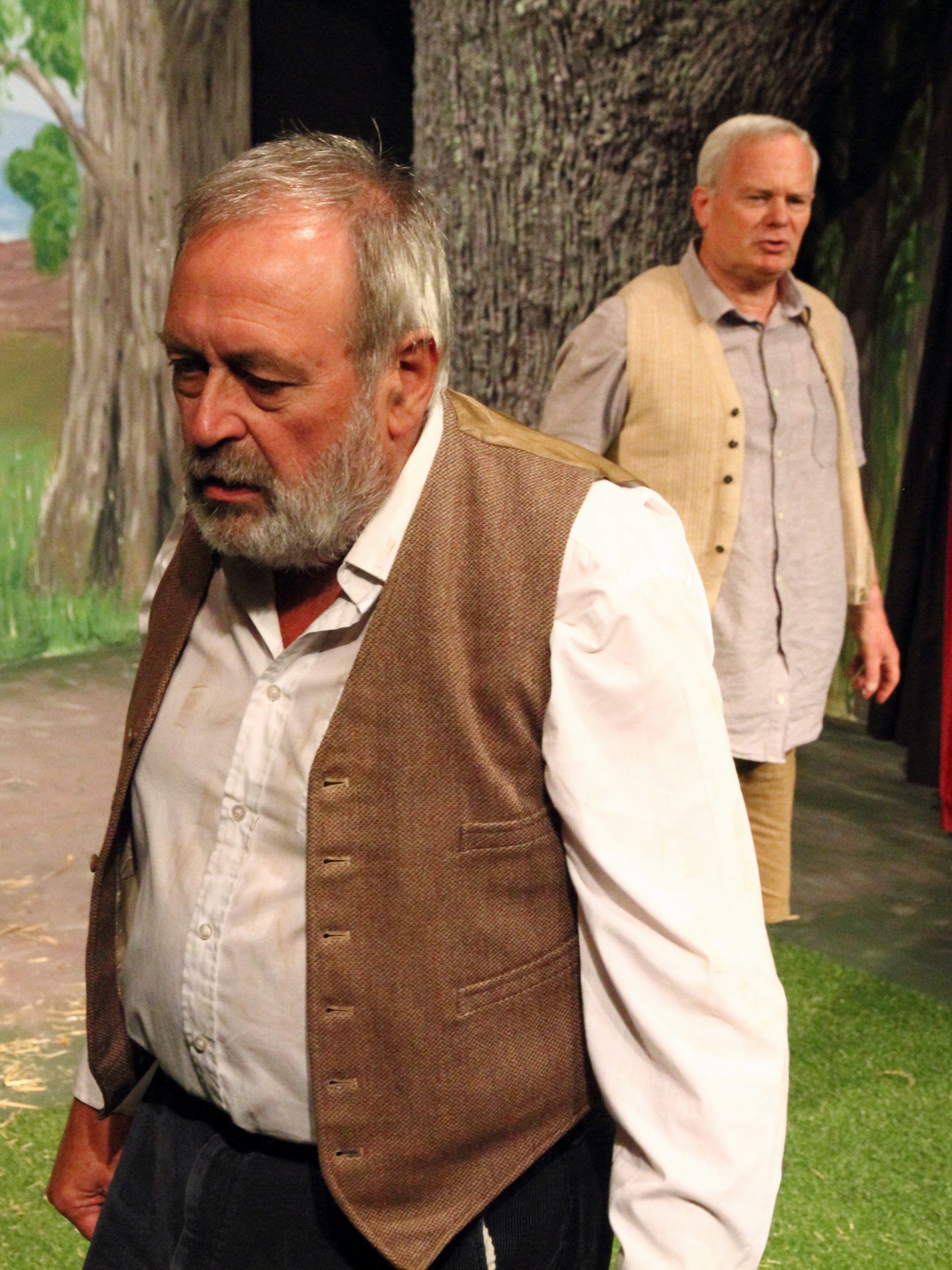 The set has a wonderful tree and an unfortunate squirrel. Its hut and realistic effects with smoke and flames are very well done. The ‘blue, remembered hills’ painted scene, ‘grass’ and straw bales provide a strong framework for the action. Good work from the sound and lighting department to back this up.