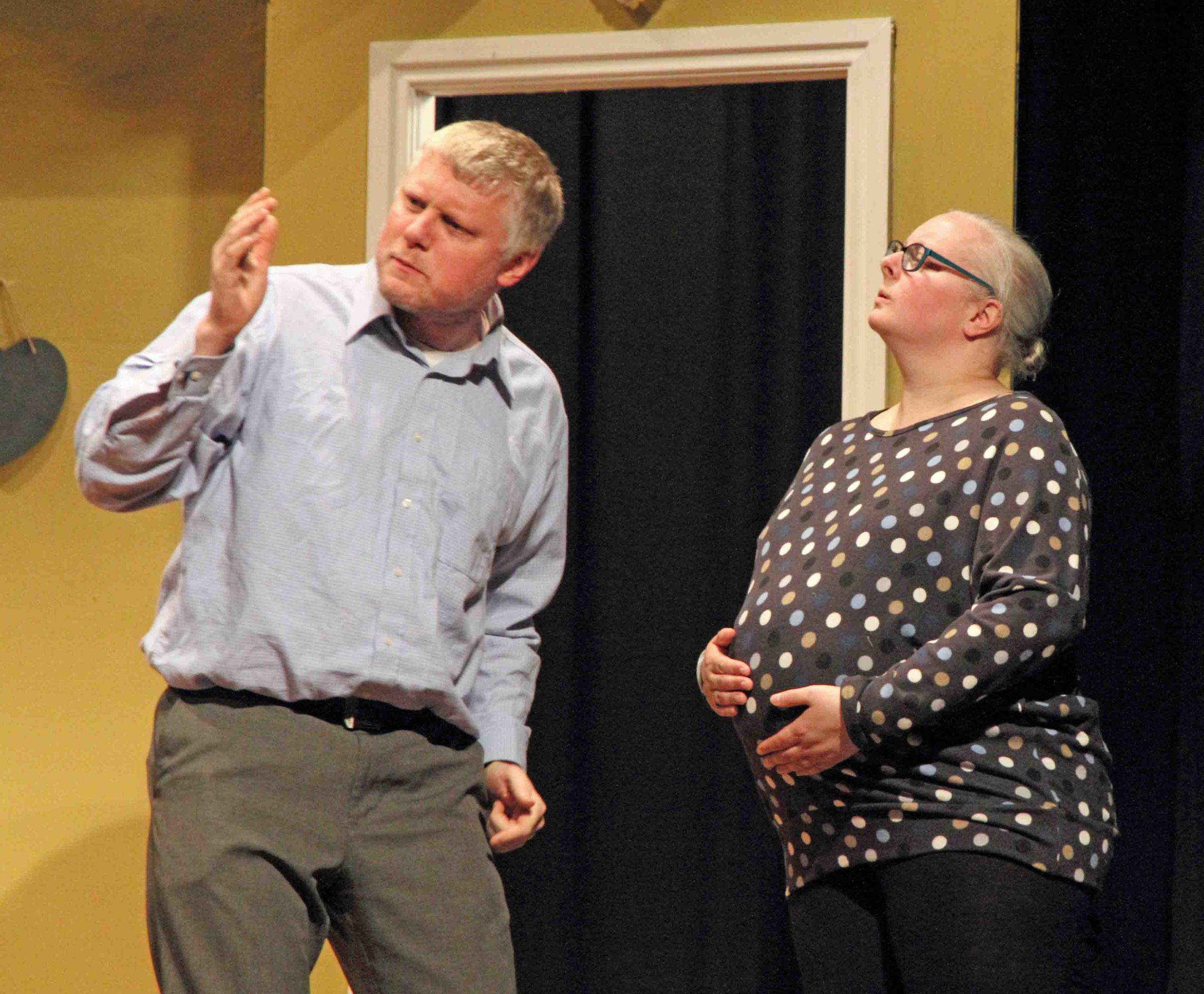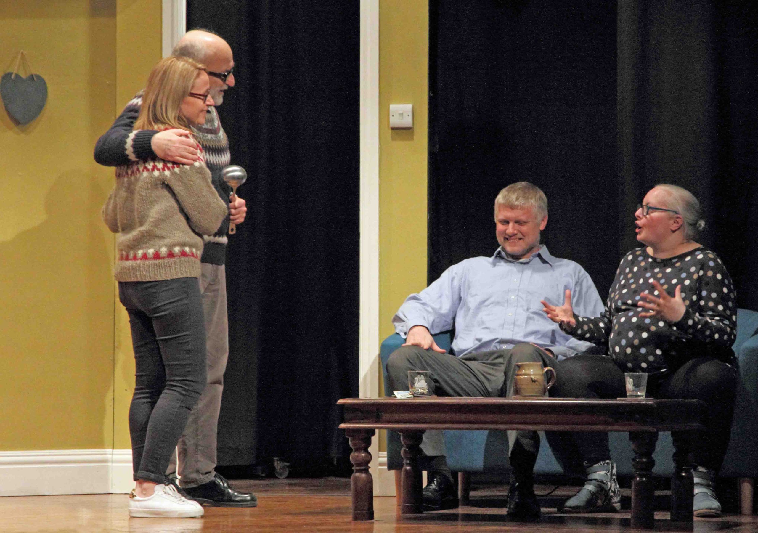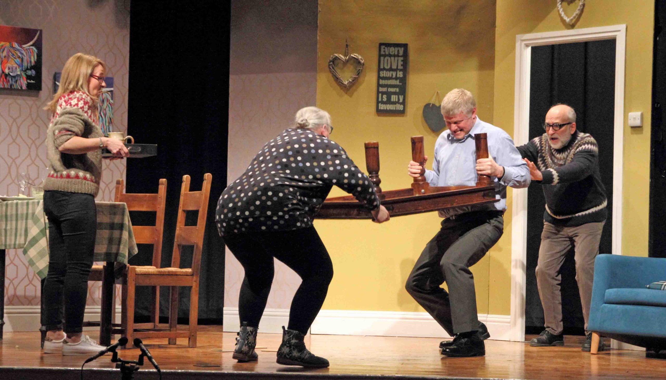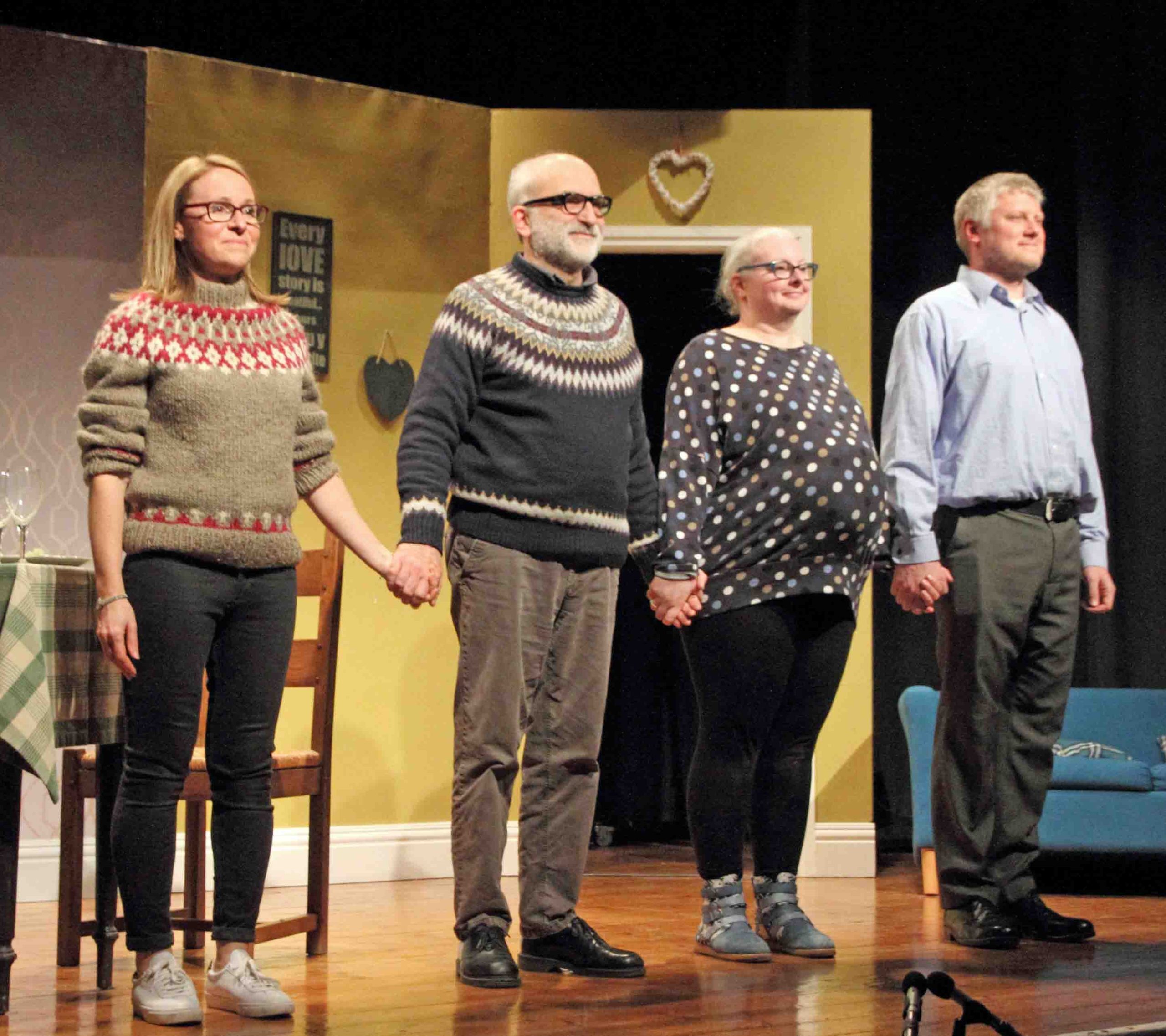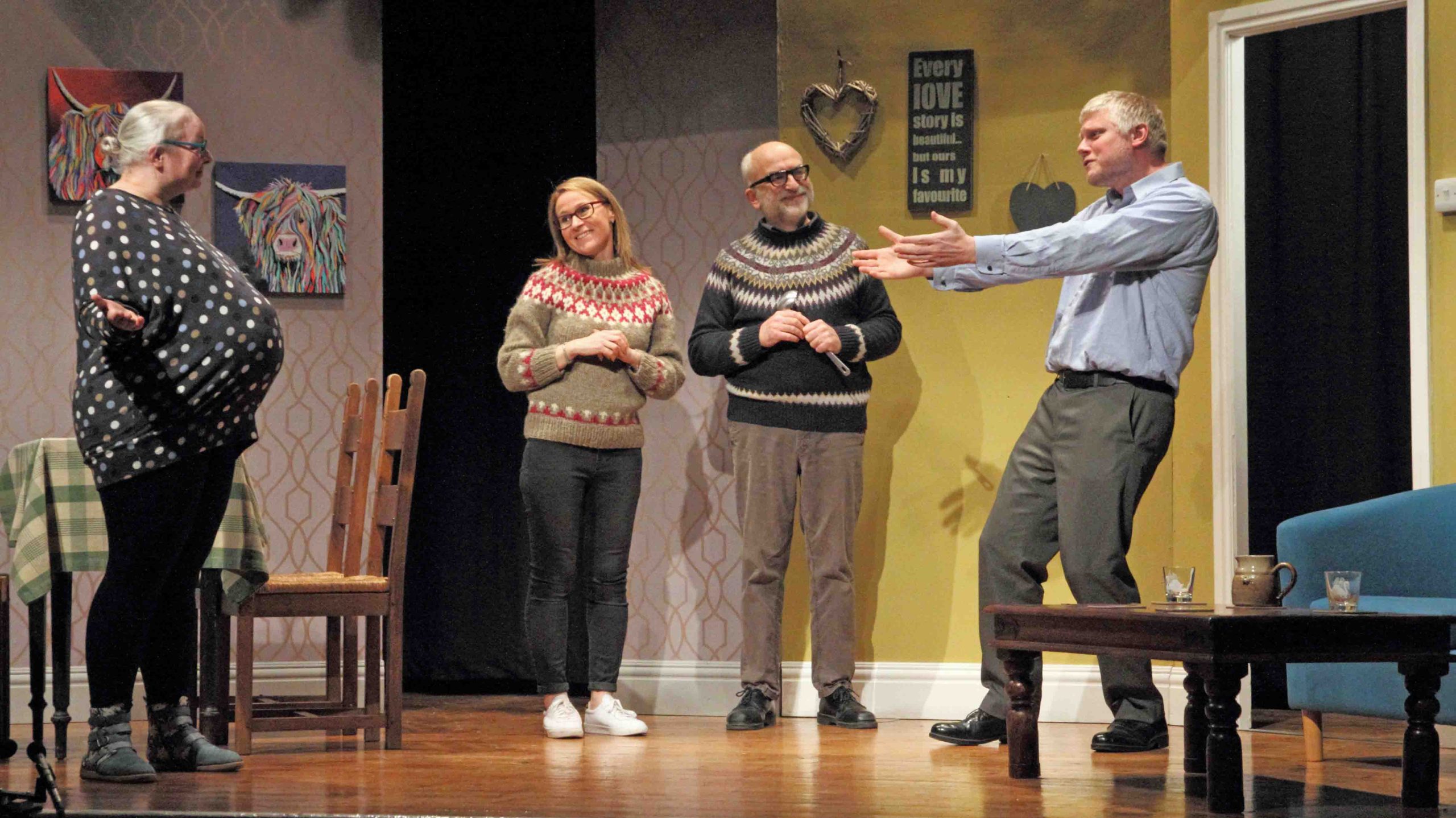 The four actors used every part of the stage, which included the off-stage kitchen, most naturally. The stage and set building crew (Justin Enthoven, Steve Colbourne, Ruth Dodsworth, Steve Hunt, Tessa Lee, Kevin Murgatroyd, Alan Stewart and Jo Wright) had achieved wonders to create this believable living space that reflected the couple’s Shetland wedding with touches such as the paintings of a highland cow and the tartan cushions which incidentally matched the sofa perfectly and the sentimental wall hangings. The costumes by Ruth Dodsworth worked well: the Fair Isle sweaters of course, the matching aprons and the star of the show – the baby bump so carefully nurtured by Heather during the production. Steve Hunt created good lighting, not always straight forward out of the Playhouse, Tom Barber gave us fitting, tongue in cheek music (I’ve got you Babe) and props were efficiently managed by Tessa Lee. The safety net of a prompt (Debbie Forsyth) was not in fact required as the play ran with clockwork precision. Congratulations to Keith Burton the director, Debbie Forsyth his assistant and his marvellous team led by Justin Enthoven. Thank you for the laughter. It was a wonderful reminder of how therapeutic excellent drama can be.