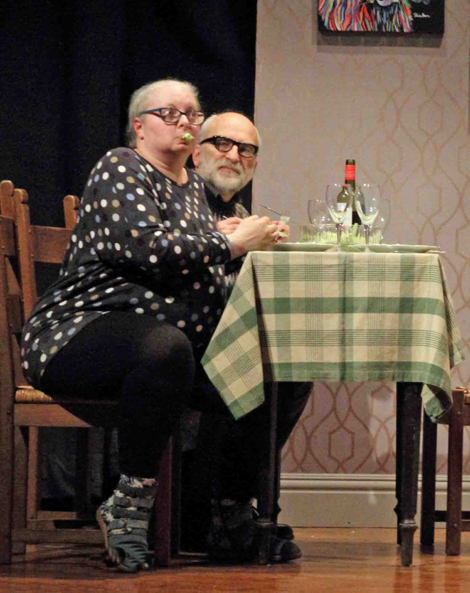 Despite being kicked under the table, Alan told it like he saw it with all the expected uproar on stage and hilarity in the audience. Edi was caught out, mid mouthful to be dragged into supporting Alan. As Heather turned to face the audience with a strand of lettuce hanging from her mouth, the Memorial Hall erupted. Jenny spun Dana’s mood and shocking invective in an instant, striking the absolute right posture and tone. Steve, however, backed his character, Lonny upstage for a more introverted meltdown which gave an effective contrast.