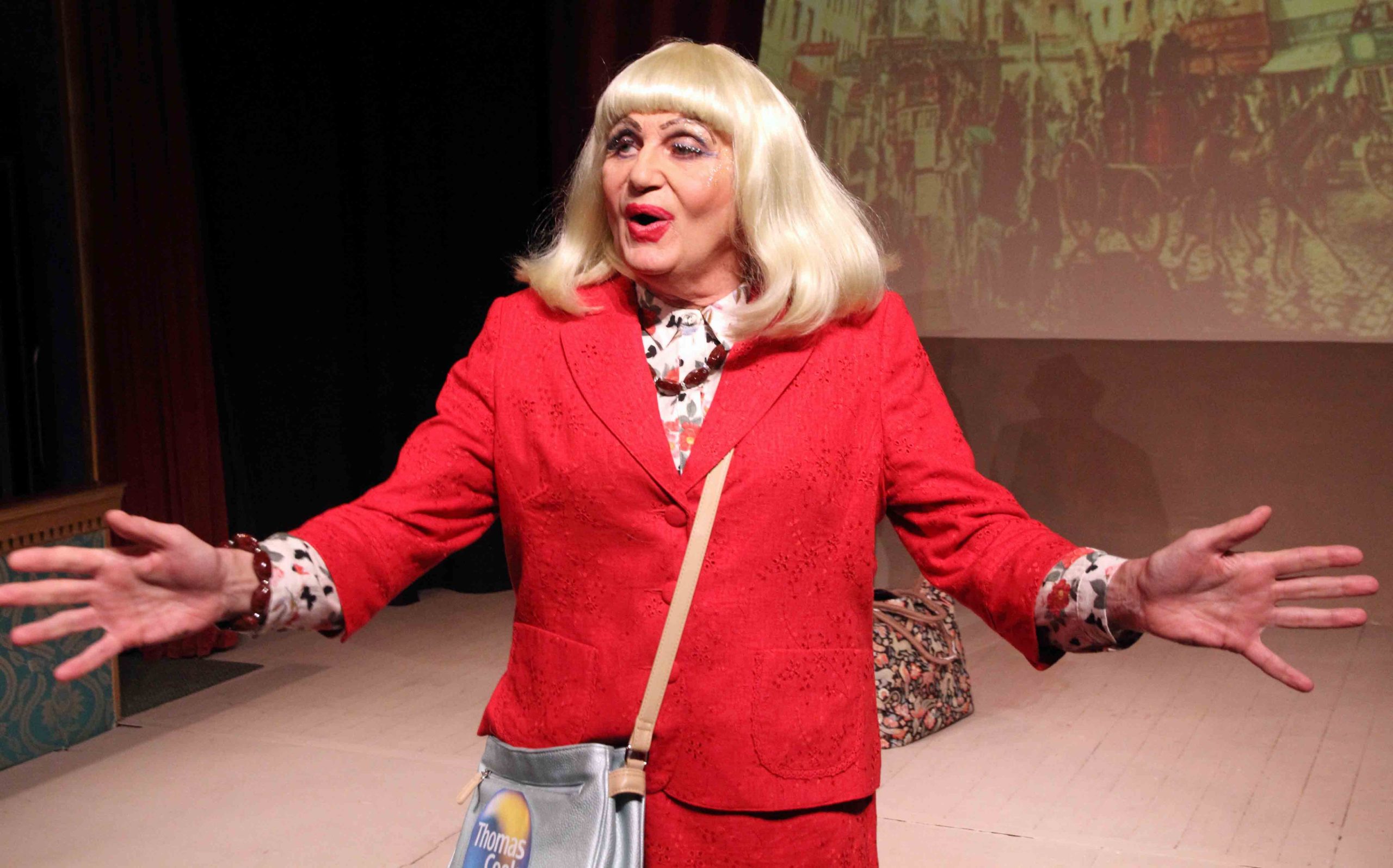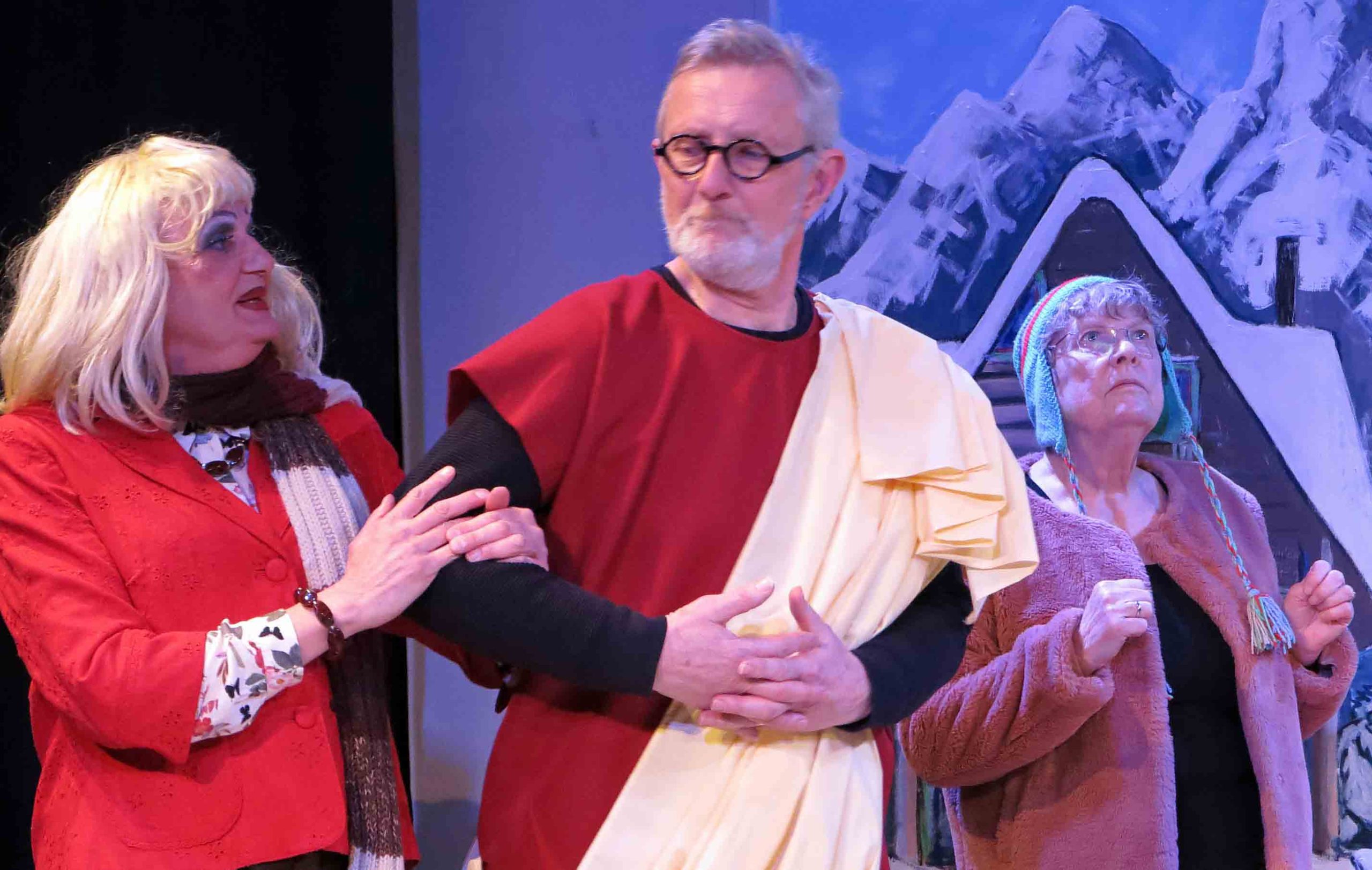The bet is made between Fogg and Gringeworthy and the journey begins, but not without the charming help of our panto fairy godmother Saturn Nirvana or “SatNav” (Jo Jefferson) who, on being summoned by the audience, offers calm advice and directions (literally). Fogg asks SatNav for the nearest travel agent and thus Amanda Cook (Peter Buller) enters.