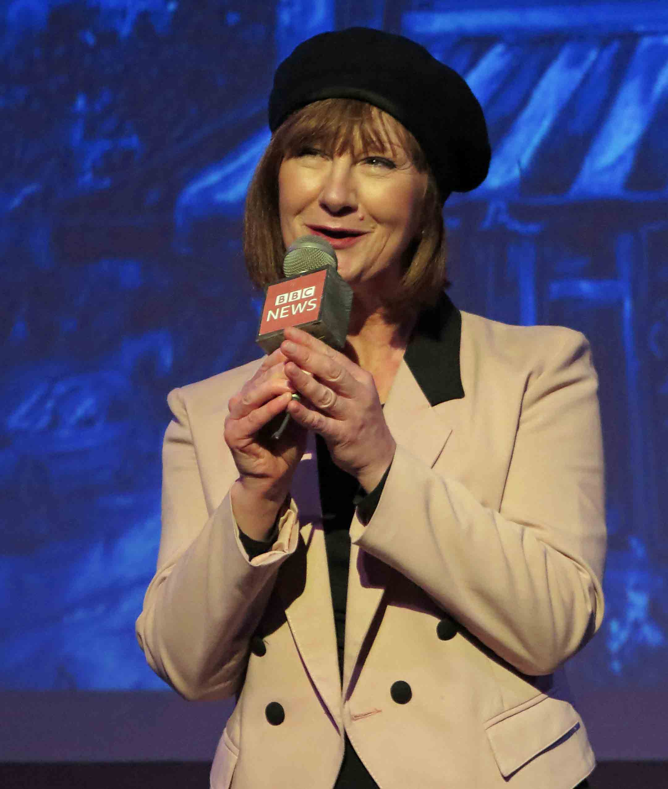 We arrive in France to a change of projected backdrop and beautifully painted scenery flats of a cafe. Progress of each stage of the journey is reported by a BBC correspondent (Carol Bailey) who skilfully changes her accent and costume throughout the performance.