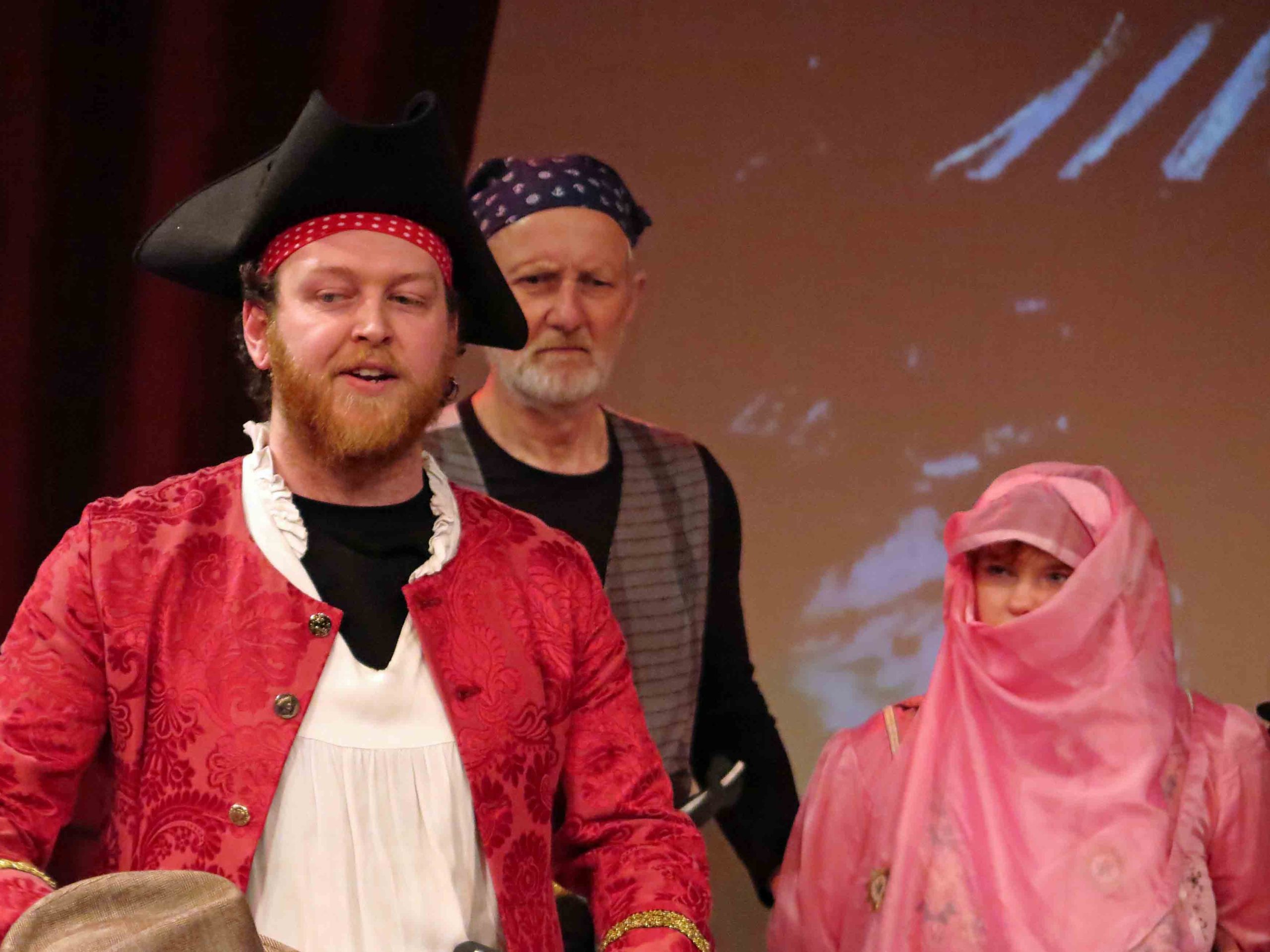Enter our travellers and immediately cue the de rigueur French language and food gags, followed by pirate gang and hidden hostage stage left. Semolina pirates to be precise with the pirate captain (George Collinson) demanding semolina pudding and other wholesome English foods – Aaaarrggghh!
