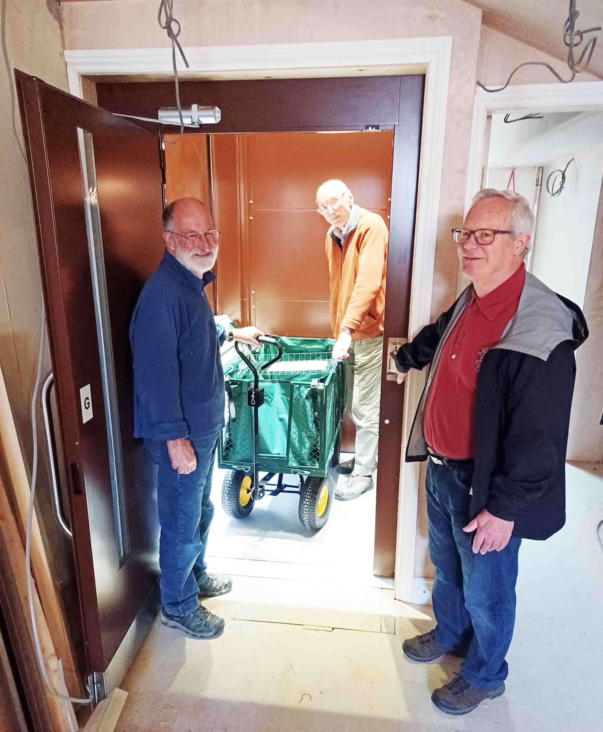 Not only is the lift now installed but it is now up and running. It has already proved its’ worth by helping to lift props and scenery up to the stage. The photo shows Justin, Keith and Steve putting the lift to good use as they prepare the stage for rehearsals of The Stray which will be our next production in the Memorial Hall from the 14th to the 18th of June.